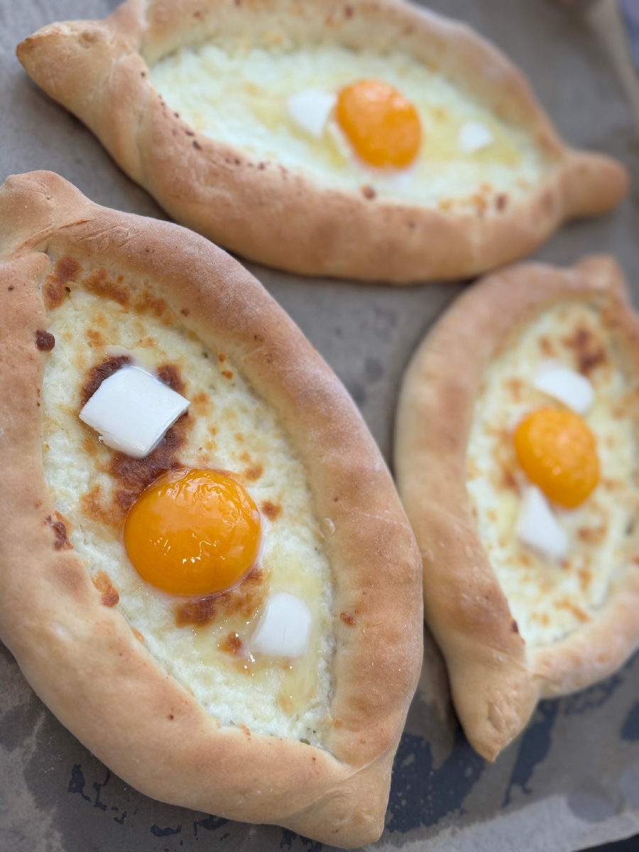 Всё, хачапури по-аджарски готовы, подаём их сразу, горячими, с пылу с жару.