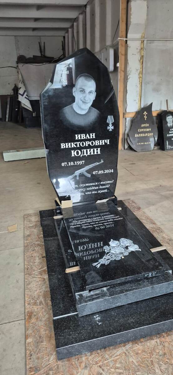 Представленный памятник – это гранитное воплощение памяти о человеке, чья жизнь оборвалась слишком рано. Он несет в себе не только информацию о жизни и смерти, но и отражает глубокие чувства близких, скорбящих о невосполнимой утрате. Дизайн и символизм: Памятник выполнен из черного гранита, материала, символизирующего вечность, силу и стойкость. Его нестандартная, скульптурная форма придает ему индивидуальность и выделяет среди более традиционных надгробий. • Портрет: На лицевой стороне памятника запечатлен портрет Ивана Викторовича. Его взгляд, улыбка – все это напоминает о его личности, о том, каким он был при жизни. Портрет выгравирован с высокой точностью, что делает его особенно трогательным. • Имя и даты: Полное имя – Иван Викторович Иодин, а также даты рождения (07.10.1997) и смерти (07.09.2024) нанесены четким, разборчивым шрифтом. Это главная информация, которая позволит будущим поколениям узнать, кого чтит этот памятник. • Символы: • Орден: Расположенный рядом с портрет