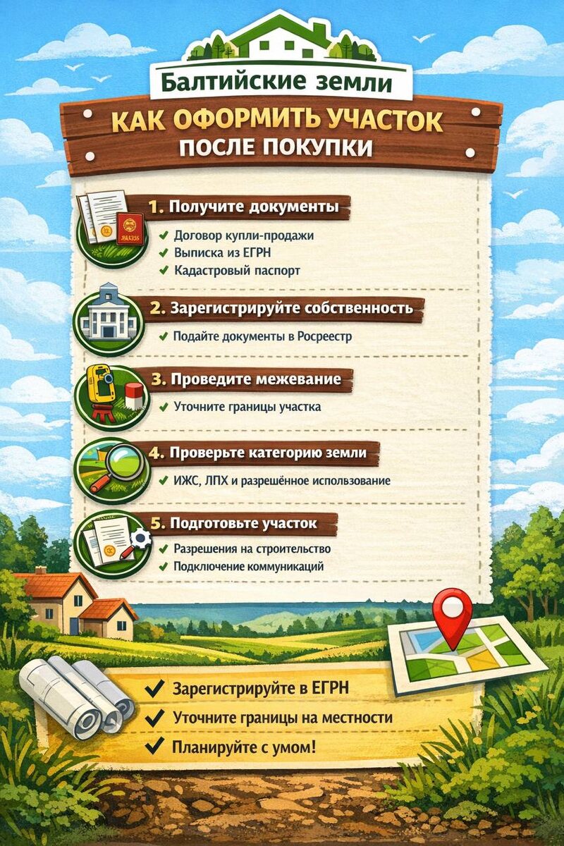 Покупка земельного участка — важный шаг к вашей мечте о доме, даче или инвестиции. Но после подписания договора — начинается не менее важная часть: правильное оформление земли в собственность и подготовка к использованию. Рассказываем, что делать по шагам 👇 🧾 Шаг 1. Получите все документы после сделки После покупки участка от Балтийские Земли вы должны получить все оформленные документы от продавца: • договор купли-продажи; • выписку из ЕГРН; • кадастровый паспорт участка; • подтверждение оплаты. 📌 Важно: эти документы - основа для регистрации права собственности и дальнейших действий. 🏢 Шаг 2. Подайте документы на регистрацию права собственности Самый главный юридический этап — регистрация вашего права на землю в Росреестре (или через МФЦ). После регистрации ваш статус владельца будет официально зафиксирован в ЕГРН. 📌 Что обычно подаётся: • заявление нового собственника; • договор купли-продажи; • выписка из ЕГРН; • кадастровые документы. ⏱️ Обычно процедура занимает несколько