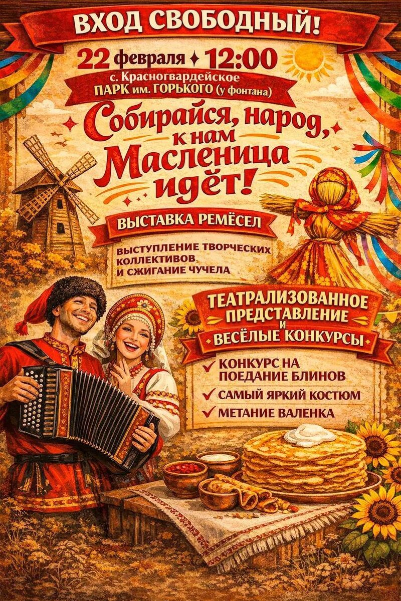 ! Приглашаем вас на самый яркий, веселый праздник Русской культуры - Масленица! 22 февраля с 12:00 вас ждёт театрализованное представление, игры и песни , танцы, загадки и викторины, инсценировки дней Масленичной недели, большой дружный хоровод и традиционное сжигание чучела Масленицы. Вас ждут весёлые конкурсы и настоящий праздничный азарт! 🎯 Метание валенка на дальность 🥞 Поедание блинов на время 👗 Выбор самого красочного костюма праздника Приходите всей семьёй — будет весело и вкусно!