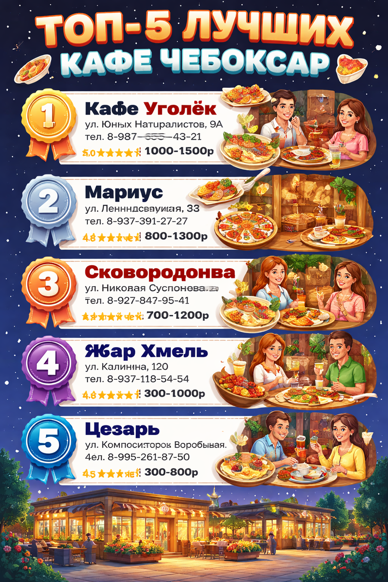 Чебоксары — город, где кафе на любой вкус. Здесь есть и стильные кофейни с чувашским колоритом, и уютные столовые с домашней едой, и восточные рестораны с шашлыком из утки, и бургерные, где собирается молодёжь до утра. Вопрос только: где действительно вкусно, а где — только интерьер и никакой души?