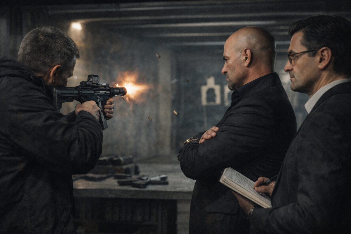 На этот раз их повели не в кабинет Бурана, как в прошлый раз, а в другое помещение – просторную комнату без окон, оборудованную под компактный тир. Воздух здесь был тяжелым, пахло оружейной смазкой и пороховой гарью. Светодиодные лампы под потолком заливали всё мертвенно-белым светом. Вдоль стен стояли металлические шкафы, видимо, с оружием и боеприпасами. На стеллажах аккуратными стопками лежали мишени, бронежилеты, несколько наушников и шлемов. В конце комнаты был оборудован стрелковый рубеж с пулеулавливателем – Сухой заметил характерные вмятины на стальном листе.