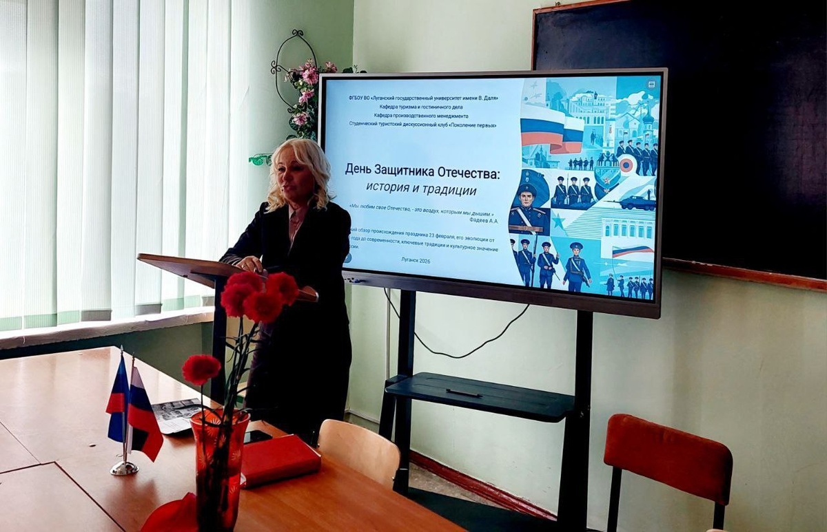 Расширенное заседание туристского студенческого клуба «Поколение первых» состоялось 16 февраля в Луганском государственном университете имени Владимира Даля. 💬 В заседании приняли участие студенты и преподаватели кафедры туризма и гостиничного дела и кафедры производственного менеджмента. В ходе встречи были рассмотрены вопросы, связанные с героическими страницами истории Луганщины. Важной датой для наших земляков является 14 февраля – День освобождения Ворошиловграда от немецко-фашистских захватчиков. В этом году отмечается 83-я годовщина этого события – символа мужества и героизма наших земляков и бойцов Красной армии, освободивших город от нацистов. 📎 Для присутствующих была проведена небольшая лекция по истории и значению важного государственного праздника – Дня защитника Отечества. В рамках функционирования клуба студенты и преподаватели кафедры туризма и гостиничного дела подготовили и презентовали туристические маршруты, которые входят в периметр историко-патриотического т