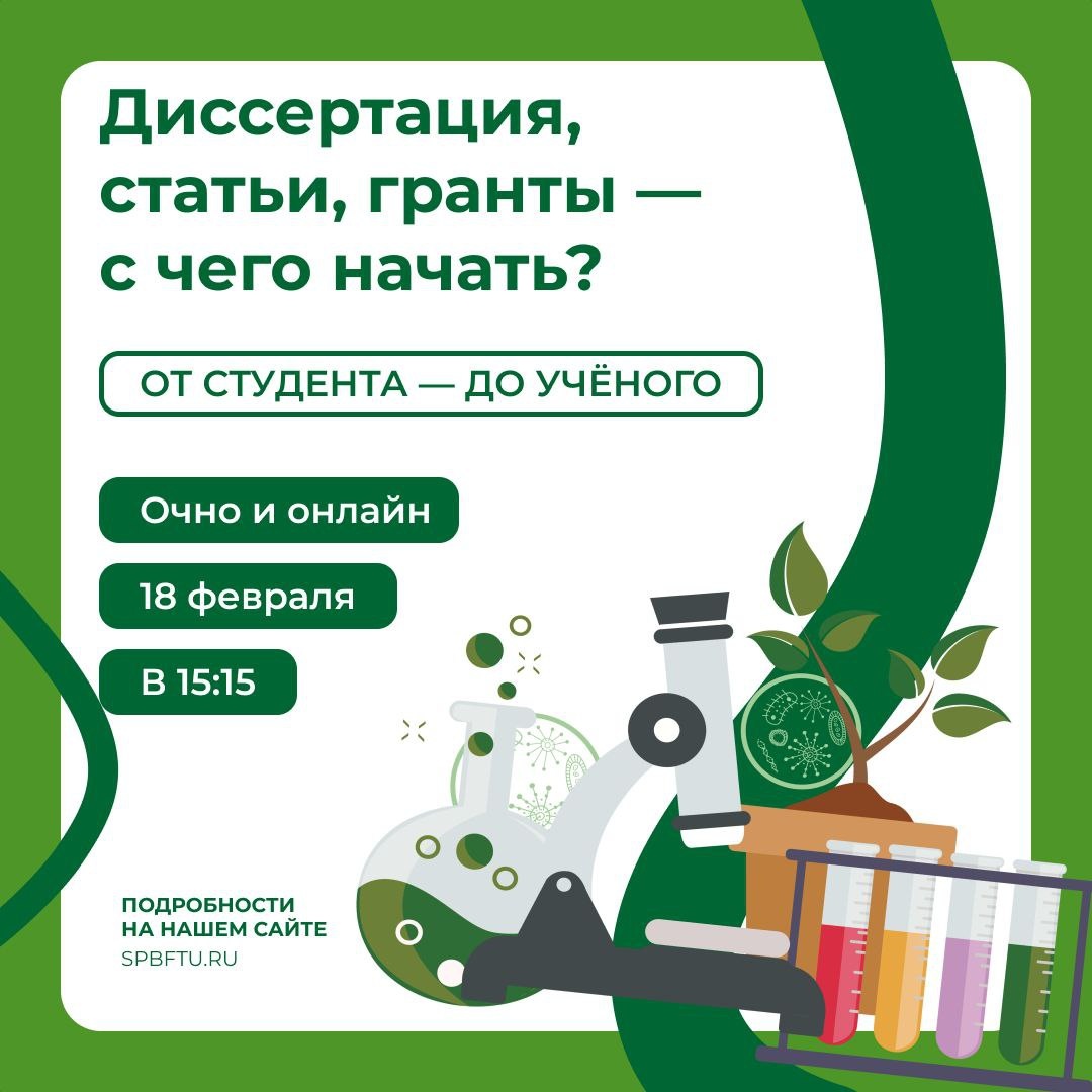 ! Уважаемые студенты, аспиранты и молодые учёные! Приглашаем вас на Научно-методический вебинар «НИР в СПбГЛТУ: направления и перспективы», который состоится 18 февраля с 15:15 до 17:30 в очном и онлайн-формате. На вебинаре вы сможете: • Узнать об особенностях подготовки и защиты диссертации • Познакомиться с актуальными научными направлениями университета • Получить советы по написанию научных статей и апробации результатов • Задать вопросы ведущим учёным СПбГЛТУ 🗓️ Регистрация открыта до 16 февраля! Участие свободное, но количество мест ограничено. 👉 Все подробности, программа и ссылка на вебинар — на сайте СПбГЛТУ 👻 МАХ | 📲 ВК | 📝 ДЗЕН
