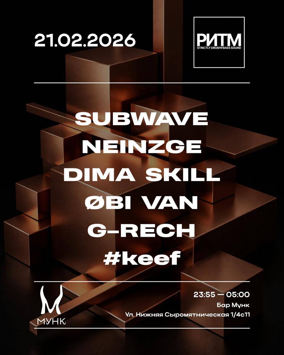 Вторая вечеринка РИТМ в Мунк! На этот раз суббота и ночной формат. Главный герой этой ночи — SUBWAVE. — один из ключевых российских dnb-продюсеров с международным именем. Его релизы выходили на ведущих мировых лейблах, в том числе HOSPITAL RECORDS, Metalheadz, Tech Itch и других. Музыка Subwave — это точный баланс мелодики, глубины и клубной энергии, проверенный танцполами по всему миру. Поддержат ночь диджеи, хорошо знакомые московской сцене и резиденты РИТМ. 🎫 Билеты / Резерв 📆 21 февраля, 23:55 — 05:00 📍Бар Мунк, Москва, Нижняя Сыромятническая 1/4с111