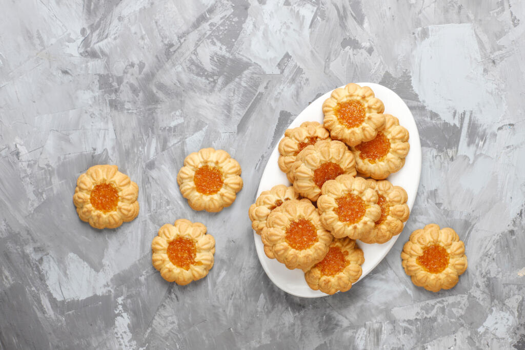 С вареньем: В печенье, пропущенное через мясорубку (или просто в кружочки), сделайте пальцем углубление и капните туда густого варенья или джема (как в «Курабье бакинское»).
