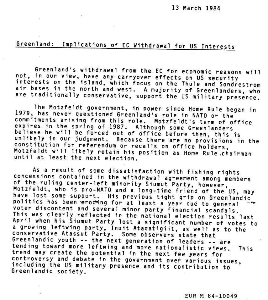 Интерес США к Гренландии - это не тренд последних лет. Рассекреченные документы ЦРУ показывают: Вашингтон просчитывал политические процессы на острове еще в 1980-х. Сегодня, на фоне конкуренции с Россией и Китаем, значение Гренландии только усилилось. Но логика американской стратегии практически не изменилась. Еще в 1984 году, когда на острове было принято окончательное решение по выходу их Европейского Сообщества, которое вскоре трансформируется в Европейский Союз, США активно следили за процессами в датской автономии и писали об этом доклады руководству. Как отмечается в докладе, выход Гренландии и ЕС совсем не противоречит интересам США, а даже наоборот. Тогдашнее консервативное общество островитян, как руководство автономии, поддерживали тесную связь с Вашингтоном и были настроены положительно по отношению к НАТО и США в частности. Уже тогда отмечался рост популярности левых партий на острове, которые, к слову, в наше время находятся у власти. Это, по мнению американских аналитиков