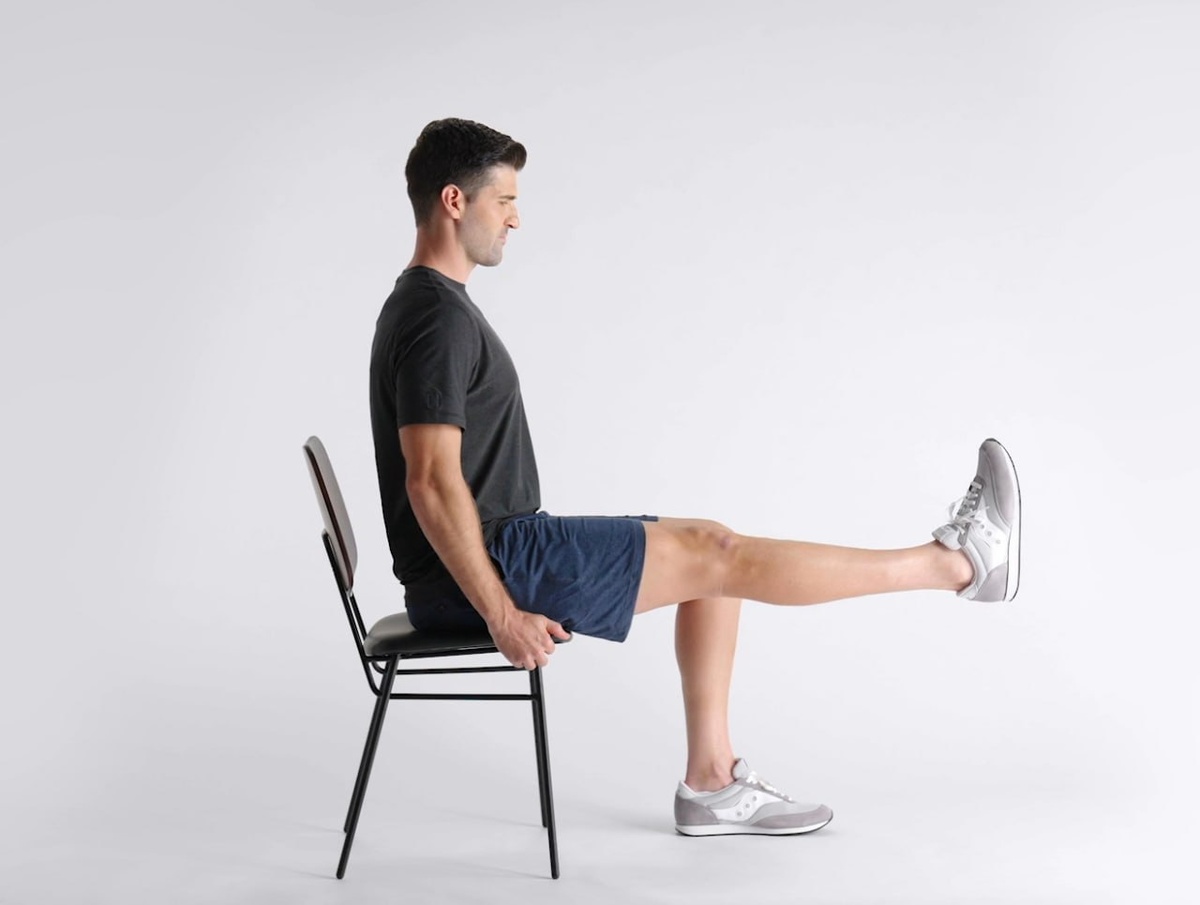 Сядьте на стул, спина прямая. Медленно выпрямляйте одну ногу в колене, удерживайте 2–3 секунды, затем опускайте. Повторите другой ногой.