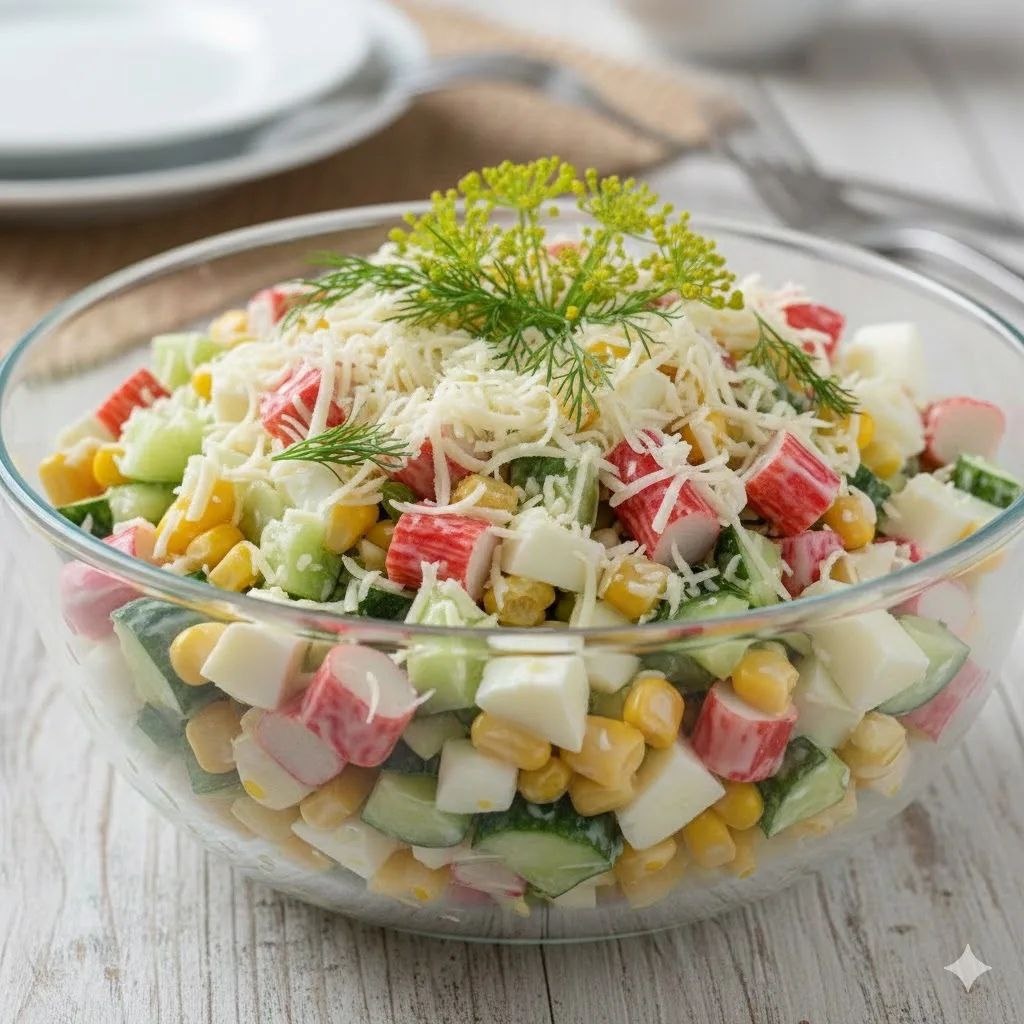 ❄️ ⏱10 минут | 130 ккал(100 г) 🛒Что нужно: 🦀Крабовые палочки — 200 г 🥒Огурец свежий — 2 шт. 🥚Яйца вареные — 3 шт. 🌽Кукуруза консервированная — 150 г 🧀Сыр твердый — 80 г 🥣Майонез или сметана — 2 ст.л. 🌿Укроп свежий — пару веточек 👩🍳Как готовить: Нарежьте крабовые палочки, огурцы и очищенные яйца мелкими кубиками. Сыр натрите на мелкой терке, чтобы салат стал воздушным. Смешайте все нарезанные ингредиенты в миске, добавьте сладкую кукурузу без жидкости. Заправьте соусом, добавьте мелко порубленный укроп и перемешайте до однородности.