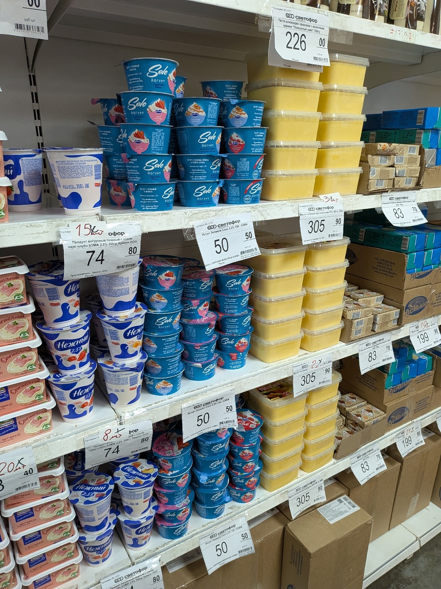 В кое-то веки в "Светофор" мы отправились не ради новинок или в связи со случайным стечением обстоятельств, а вполне себе осознанно, зная, что именно нужно/хочется купить. Я в целом-то не так много приобретаю в этом магазине, но запасы бакалеи, мороженого и других продуктов нередко пополняю как раз здесь, причем из-за низкой цены, разницы в качестве толком не замечала, а потому и не хочу переплачивать. Хоть я и сама придерживаюсь некоторых стереотипов о том, что какие-то продукты просто не хочу покупать в подобных магазинах, сейчас их стало гораздо меньше, уже и молочные продукты просматриваю (творог так и вовсе для выпечки тут и покупаем), и даже мясные, правда исключительно в вакууме. Все эти открытые коробки с замороженной рыбой и мясом по-прежнему мимо, выглядят не очень привлекательно для покупки. Давайте покажу продукты, которые порадовали, те, что захотелось купить, а заодно расскажу почему: Тот самый отдел с молочными и кисломолочными продуктами, что обычно я пропускала сразу,