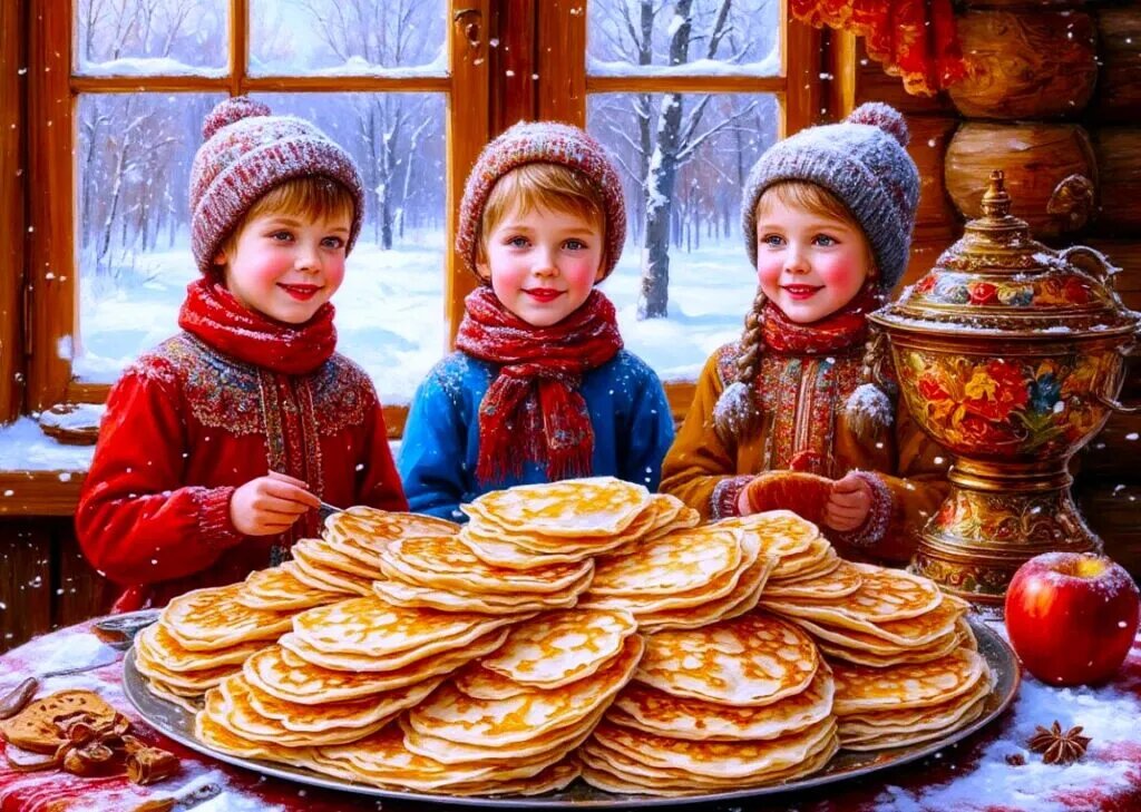 Сказка про Масленицу и Весну-Красну Для детей и взрослых В одном далёком селе, где зимы были длинными и снежными, а люди жили дружно и весело, каждый год отмечали Масленицу. Это был особенный праздник — провожали Зиму-Морозну, встречали Весну-Красну. В тот год зима никак не хотела уходить. Снега намело по самые крыши, морозы трещали так, что деревья в лесу жалобно скрипели. Дети уже устали лепить снеговиков и кататься с горок — все мечтали о тепле, зелёной траве и первых цветах. — Пора бы Масленице прийти, — вздыхали старики. — Без неё Весна не решится в наши края заглянуть. И вот в воскресенье утром над селом поплыл аппетитный запах блинов. Бабушка Марфа первая распахнула ставни и крикнула: — Масленица идёт! Первый блин — на угощение Зиме! Все жители вышли на улицу. Кто-то нёс стопки румяных блинов, кто-то — мёд и варенье, кто-то — горячий сбитень. На главной площади поставили чучело Масленицы — в ярком платке, с лентами и колокольчиками. Дети водили хоровод и пели: Масленица-сударыня