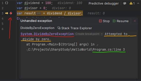 Во-первых, исключение показывается на полях в виде молнии. Во всплывающем окне указаны: красное - класс исключения (да, те самые классы, которые мы можем создавать сами), жёлтое - сообщение с подробностями, зелёное - файл и номер строки кода.