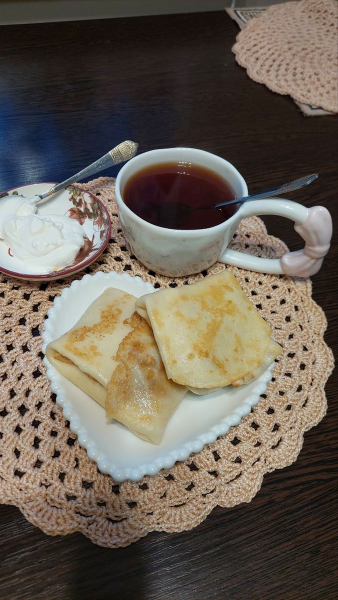 Уже вечер, а у меня только руки дошли до приготовления блинов🥞 Эти с солёными творогом, сметанкой и сладким горячим чаем - захотела именно