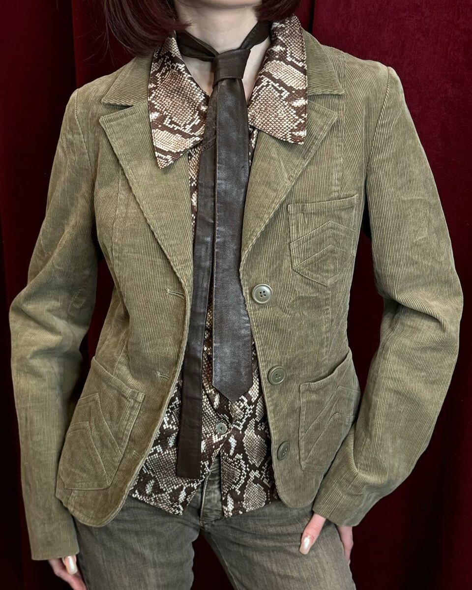 🤎 Первый — приталенный жакет оливкового оттенка. Более собранный, структурный, с акцентом на силуэт и детали. Второй — укороченная вельветовая куртка глубокого хвойного цвета. Более расслабленная, с настроением casual и отсылкой к культовой джинсовке, но в более тёплом и благородном прочтении. Металлические пуговицы, плотный рубчик, чуть более свободная посадка. Оба прекрасно работают в многослойности: рубашка с анималистичным принтом, узкий галстук, прямые брюки — и образ уже звучит как модная хроника нулевых. Первый жакет - 3.700р, размер 38-40 Второй жакет - 2.900р, размер 40 Рубашка питон - 2.800р, размер 42 Галстук кожаный (есть много разных оттенков) - 1.500р