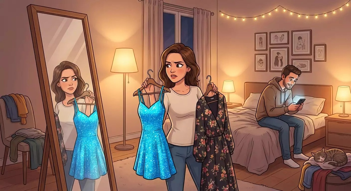 Муж с женой собираются в театр. Жена крутится перед зеркалом: