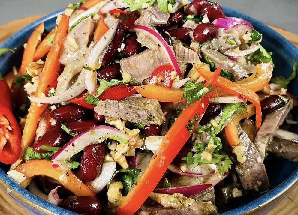 - Нам понадобится отварная говядина, красный болгарский перец, желтый болгарский перец, свежий огурец, ядра граната, фасоль красная, ялтинский лук, грецкий орех, кинза, оливковое масло, сок лимона, соль, перец чёрный молотый, зернистая горчица