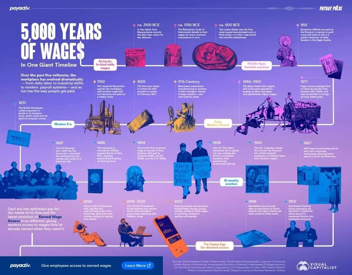 ⚡️ Импульс зарплаты: 5000 лет истории оплаты труда на одной временной шкалею.На протяжении тысячелетий форма оплаты труда отражала то, как