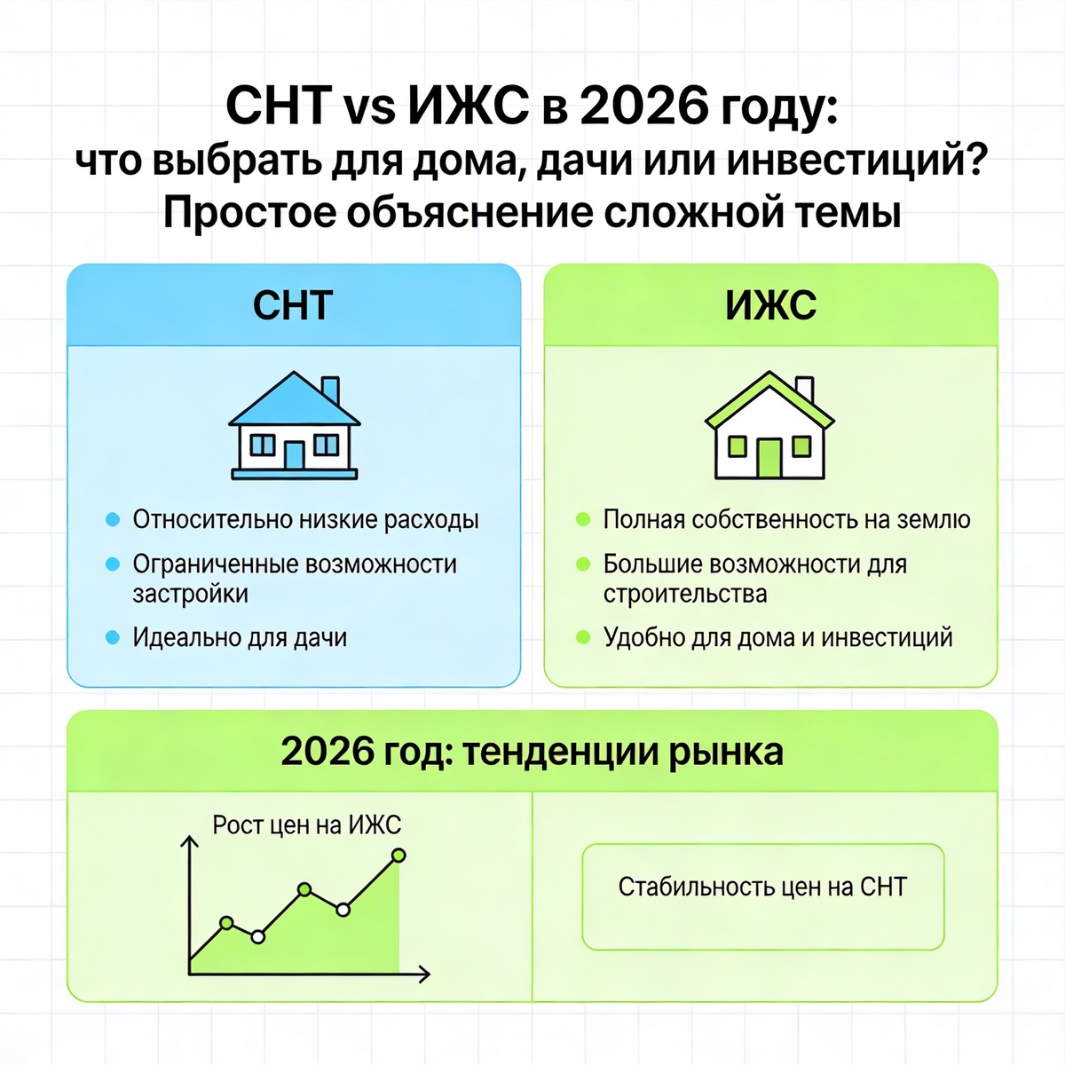 **ИЖС** ликвиднее, продать проще. Но **СНТ** рядом с городом тоже ходовой товар. Тренд 2026 года: молодежь скупает участки в СНТ, чтобы строить дом с удаленкой. Это драйвер спроса .