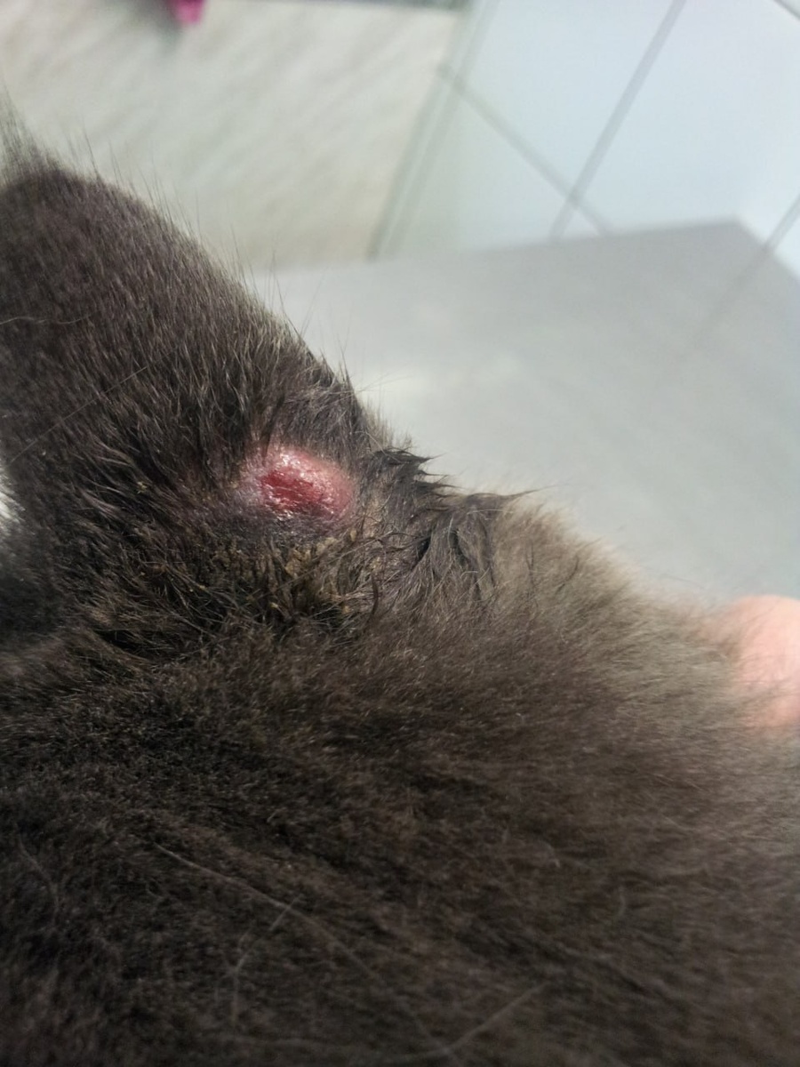 Микроспория локализованная на правом ухе на первом визите и через 14 суток после начала лечения. Диагноз подтвержден лабораторно. Лечение - местное и вакцинация от дерматомикозов.
