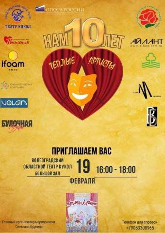 В Волгограде региональная общественная организация «Инклюзивный театр “Теплые Артисты”» отмечает юбилей — 10-летие своей деятельности. По этому случаю 19 февраля в Театре кукол пройдет торжественный вечер. В программе: показ фрагментов фильма «Теплые Артисты», созданного волгоградским режиссером Александрой Болдыревой, которая стала победительницей 13-го Международного кинофестиваля «Skey-cinema» в категории «Лучший документальный фильм». С праздничным концертом, включающим сцены из театральных постановок, модный показ и танцевальное представление, выступят участницы четырех ключевых проектов «Теплых Артистов» — «Горожанки», «Особа», «Артисты» и «Танцы на колясках». В фойе Театра кукол будет организована выставка, посвященная истории организации. Отметим, «Теплые Артисты» — это уникальный культурный проект, направленный на создание равных возможностей для людей с особенностями. Они своим примером показывают, что границы для творчества не существуют, и что в этом мире нет ничего невозмо