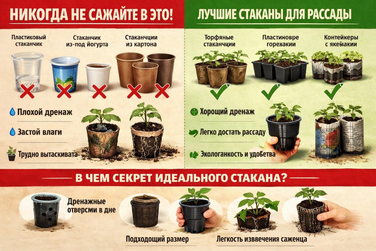 (Разоблачение убийц вашей рассады: от торфяных горшочков до прозрачных стаканов. Спасите корни, пока не поздно!) ❌ ВАС ОБМАНЫВАЮТ В МАГАЗИНАХ! Красивые торфяные горшочки, модные кассеты, дешевые стаканчики из-под йогурта — 90% этой тары убивает вашу рассаду медленно и незаметно. Корни задыхаются, гниют, загибаются, а вы думаете: "Плохой сорт, мало света, мало удобрений". НЕТ. Проблема в том, в чем вы держите растение. Главный секрет: Идеальный стакан для рассады — это не тот, который красивый или дешевый. Это тот, который создает идеальный микроклимат для корней: дышит, не перегревается, не закисает и позволяет корням равномерно освоить весь объем. Если у вас есть старые плотные стаканы, но они прозрачные, сделайте их идеальными за 1 минуту: Идеальный стакан: Торфяные горшки и прозрачные стаканы без защиты — в мусорку. Жаба душит выбросить? Заверните прозрачные в бумагу и используйте, но лучше купите нормальные один раз на годы.