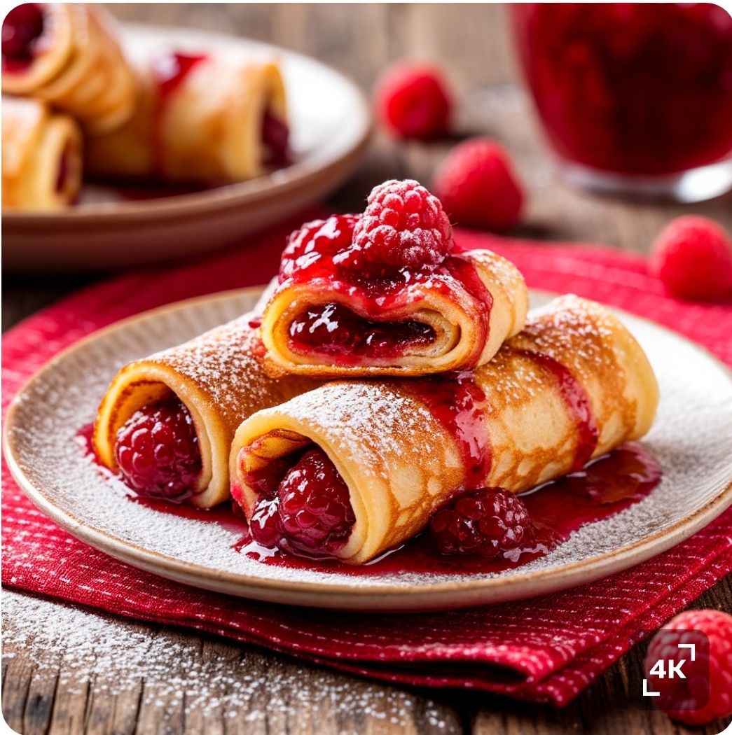На готовые блины щедро выкладывайте остывшую малину с сахаром, аккуратно заворачивая их в рулет или просто складывая пополам. По желанию, подайте блины с шариком ванильного мороженого или ложкой взбитых сливок для дополнительного удовольствия.