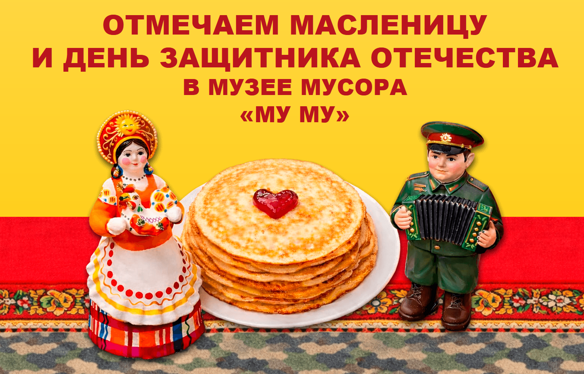 Художественный МУзей МУсора «МУ МУ» приглашает 22 февраля проводить зиму и встретить весну, а 23 февраля отметить День защитника Отечества. 22 февраля приглашаем всех на масштабное и весёлое торжество. В программе: 12:00–15:00 — Мастер-классы в «МУ МУ» 13:30–15:00 — Масленичные гуляния Праздник для всей семьи под открытым небом! Вас ждут настоящие зимние развлечения: 15:00 — Сжигание чучела Масленицы Традиционная кульминация праздника: вместе провожаем зиму и встречаем весну. 15:30 — Итоги конкурса костюмов В течение всего дня проходит конкурс на самый креативный масленичный костюм. Проявите свою фантазию и мастерство — победители получат призы! Бесплатный вход в «МУ МУ» 22 февраля для детей до 5 лет в костюме Масленицы. Обязательные тематические атрибуты: головной убор, элемент одежды и аксессуары. 23 февраля в Художественном МУзее МУсора пройдёт праздник для детей и взрослых. Приходите, чтобы провести день вместе, создать сувениры своими руками и подарить близким внимание и эмоции.