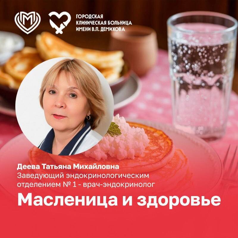 🥞 🫖Масленичная неделя — это не только время веселых гуляний, но и нагрузка на организм. Для многих людей этот праздник становится испытанием, особенно для тех, кто страдает сахарным диабетом или стремится поддерживать здоровый вес. ❤️Заведующий эндокринологическим отделением №1, врач-эндокринолог Татьяна Михайловна Деева дает рекомендации, как насладиться вкусными блинами, не навредив здоровью. ✅Контроль углеводов Чтобы избежать резких скачков глюкозы, выбирайте тонкие блины, приготовленные из цельнозерновой муки или гречневой крупы. Такие продукты богаты клетчаткой, которая замедляет усвоение углеводов. ✅Ограничьте порции Один-два небольших блина вполне достаточно, чтобы почувствовать вкус праздника. ✅Добавляйте белки и жиры Белковые начинки, такие как творог, куриная грудка или рыба, помогут снизить гликемический индекс блюда. Жиры также способствуют постепенному всасыванию углеводов, поддерживая стабильный уровень сахара. ✅Избегайте сладких начинок, таких как варенье, джемы и