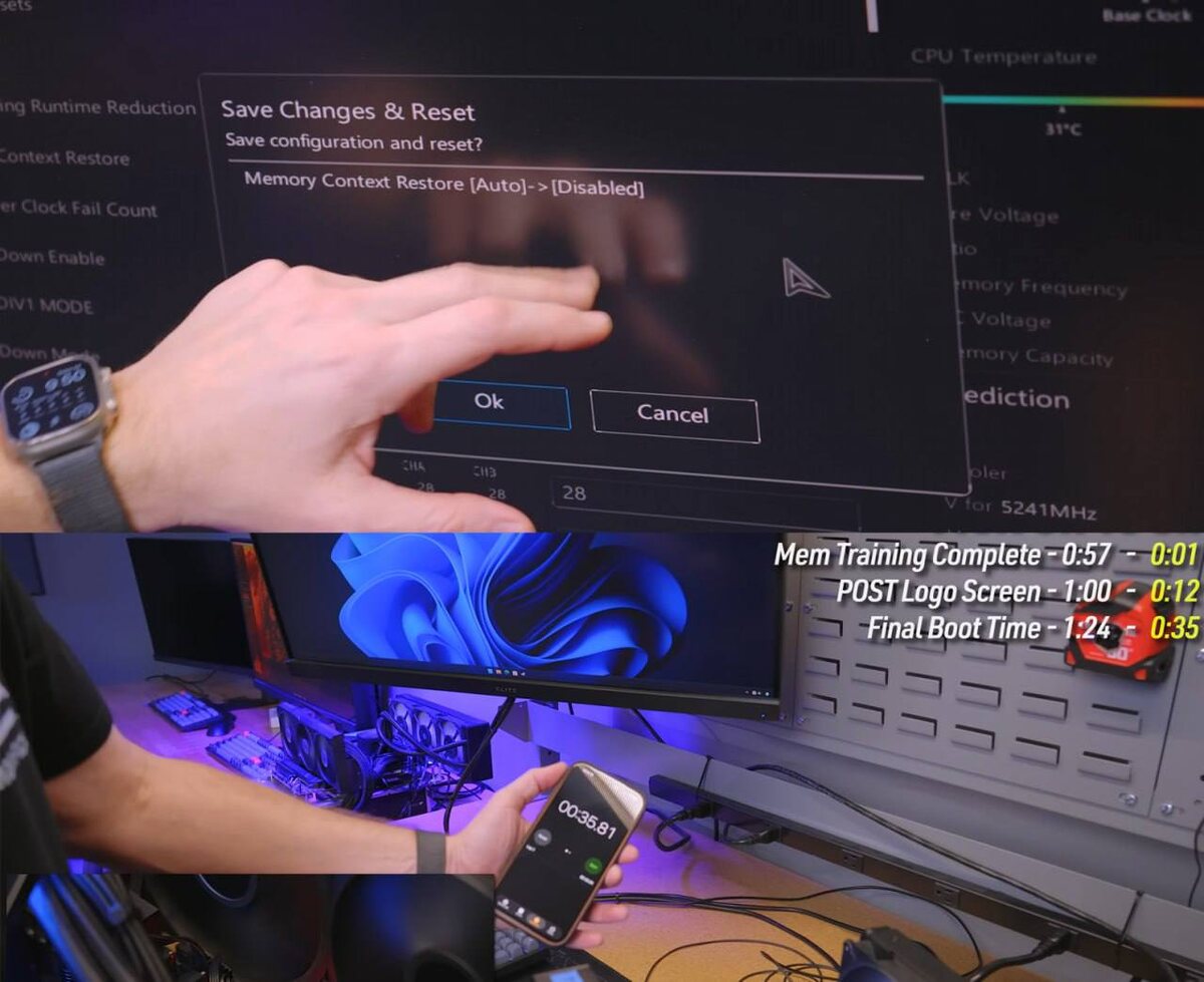 Каждый раз при холодном старте система заново «тренирует» оперативную память: проверяет стабильность таймингов, субтаймингов, напряжений, совместимость профиля. На DDR5 это особенно заметно — процедура может занимать десятки секунд. Функция Memory Context Restore (MCR) просто сохраняет результаты предыдущей «тренировки» ОЗУ и не запускает её заново при каждом включении. Практика Блогер JayzTwoCents протестировал MCR на связке: • ASUS ROG Crosshair X870E • 32 ГБ DDR5-6000 • Ryzen 9 9800X3D Результат: • Без MCR — 1 минута 24 секунды до загрузки • С включённой MCR — 35 секунд Минус 58% времени старта. Почему это работает DDR5 требует более сложной и долгой инициализации, чем DDR4. Особенно при использовании EXPO/XMP-профилей и ручного разгона. MCR экономит время за счёт того, что система доверяет уже проверенной конфигурации. Есть ли нюансы? Да: • при нестабильных настройках возможны проблемы; • после сброса BIOS или изменения параметров памяти тренировка всё равно запустится з