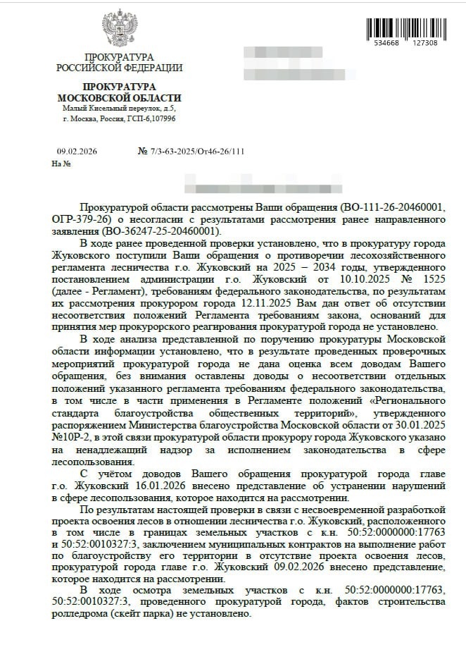 " Что ни день, то представления. По итогу обращений граждан прокуратура вновь указала главе Жуковского Андронику Паку на нарушения в сфере лесопользования и при заключении муниципальных контрактов на благоустройство городского лесничества в отсутствии проекта освоения лесов. Речь о Треугольном лесе и части парка культуры и отдыха, которые собрались благоустраивать почти за полтора миллиарда рублей. Что теперь будет с уже отыгранными контрактами на их редизайн, в ответе надзорного органа не сообщается. Прокуроры также на всякий случай поискали в лесничестве незаконный роллердром и доложили, что "фактов его строительства не установлено". ИСТОЧНИК • прислать новость