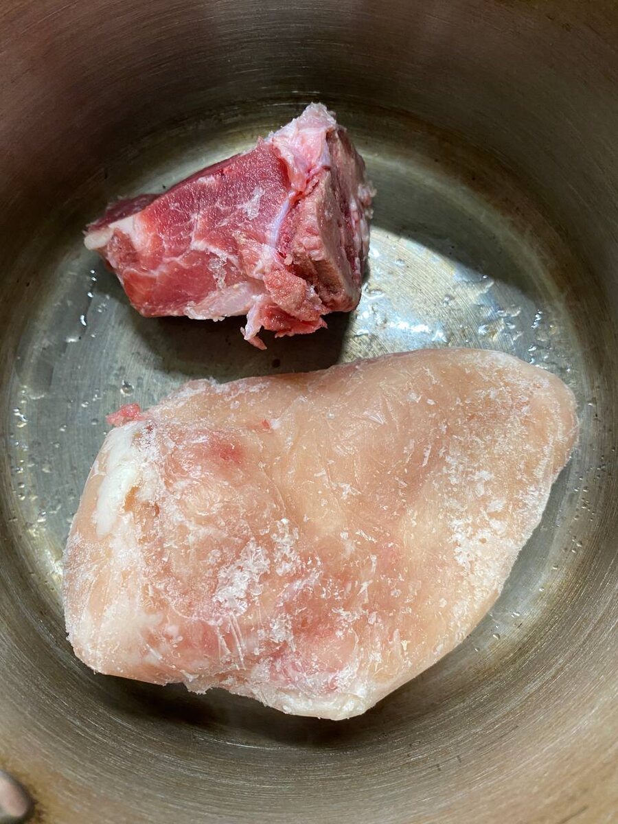 - В кастрюлю наливаем воду, кладём куриную грудку и кусочек говядины (примерно в два раза меньше грудки).