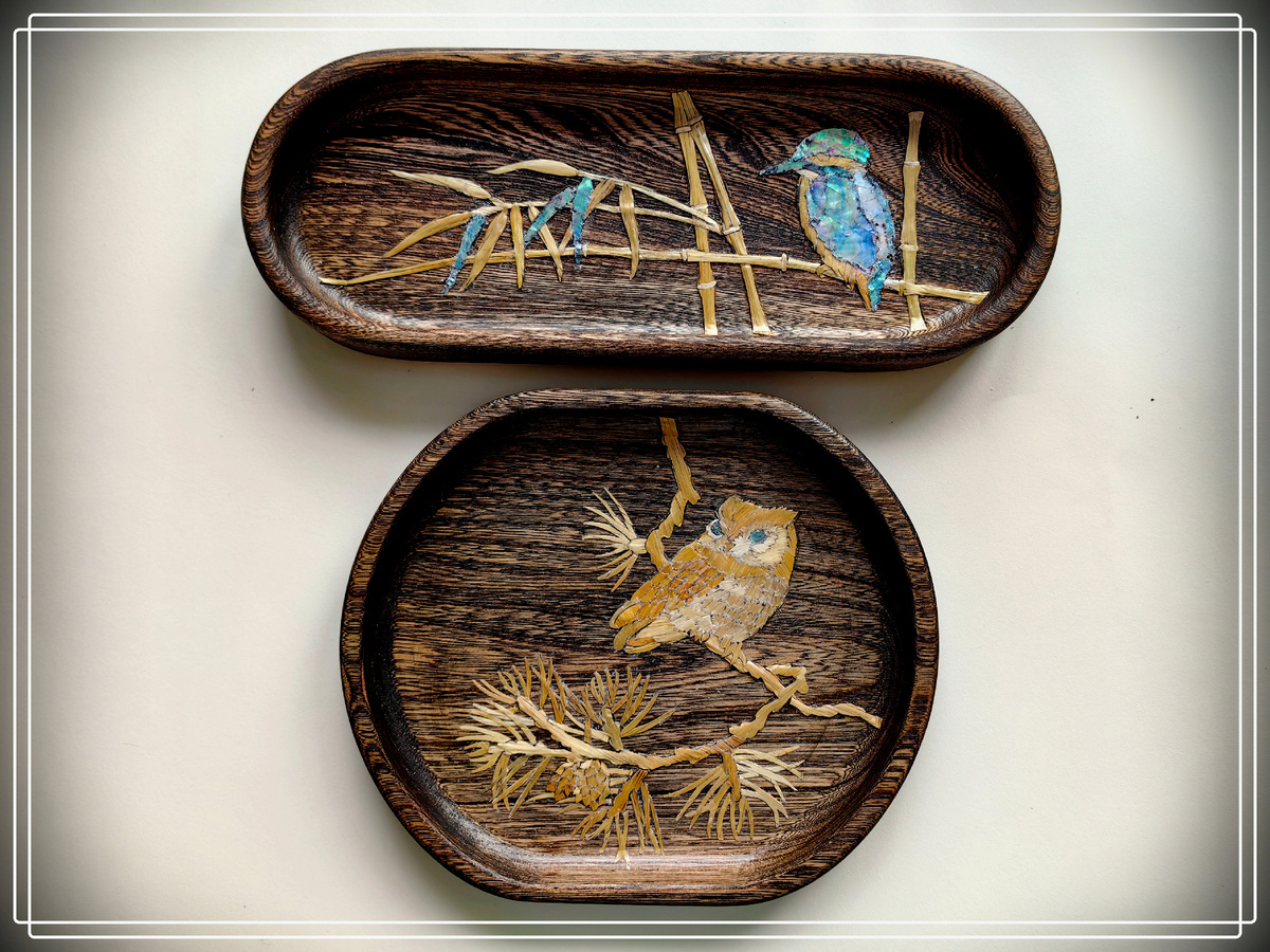 Некоторое время назад я начала работать над необычной ботанической серией. Необычной она получилась потому, что "рисовала" я (выражаясь фигурально)) на небольших деревянных подносах не красками, а с помощью соломки и перламутра Серия получилась очень удачной, но мне захотелось немного отдохнуть от изображения цветов. И следующие подносы я украсила иначе. С этими подносами из вяза работать вообще очень приятно. Красивая текстура дерева, очень качественная обработка, удачный, не слишком темный цвет. Форма на этот раз разная И оба словно сами подсказали мне идею рисунков для них В мозаике из соломки очень важно правильно определить, в каком направлении наклеить соломку на каждую деталь. А еще правильно подобрать соломку по цвету. Для веток, к примеру, я всегда беру немного коричневатую соломку. Так потом при обжиге легче передать текстуру дерева. А вот для иголочек стараюсь брать самую светлую (но не белую) и мягкую соломку. Иначе обжиг слишком вытемнит их. Есть еще один секрет - подбира