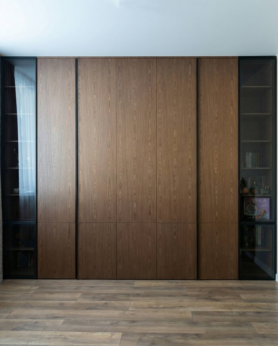 ➡️ В этом проекте шкаф решает не только задачу хранения. Он формирует всю стену и работает как часть интерьера. ✔️ Фасады выполнены в натуральном шпоне с вертикальным направлением текстуры. За счёт этого поверхность воспринимается цельной плоскостью, без ощущения отдельных секций. ✔️ По краям размещены витрины с тонированным стеклом. Они визуально разгружают композицию и создают глубину. ✅ В итоге система хранения выполняет полностью свою задачу, а интерьер воспринимается цельным и завершённым. 🏡 MebeLi-TO - проектируем и изготавливаем мебель по индивидуальным размерам. _______________ Получить онлайн консультацию Рассчитать стоимость проекта Записаться в шоурум