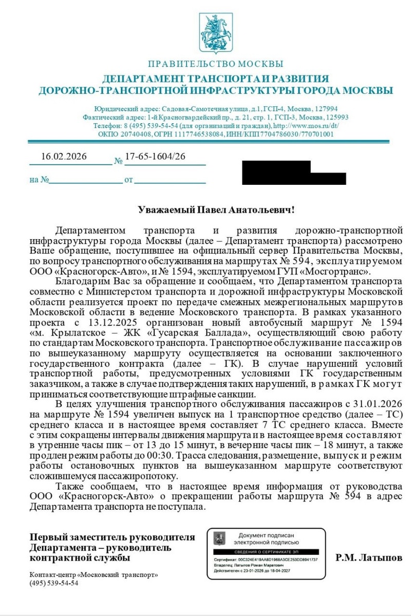 Ответ дептранса по поводу прекращения работы 594 маршрутки.