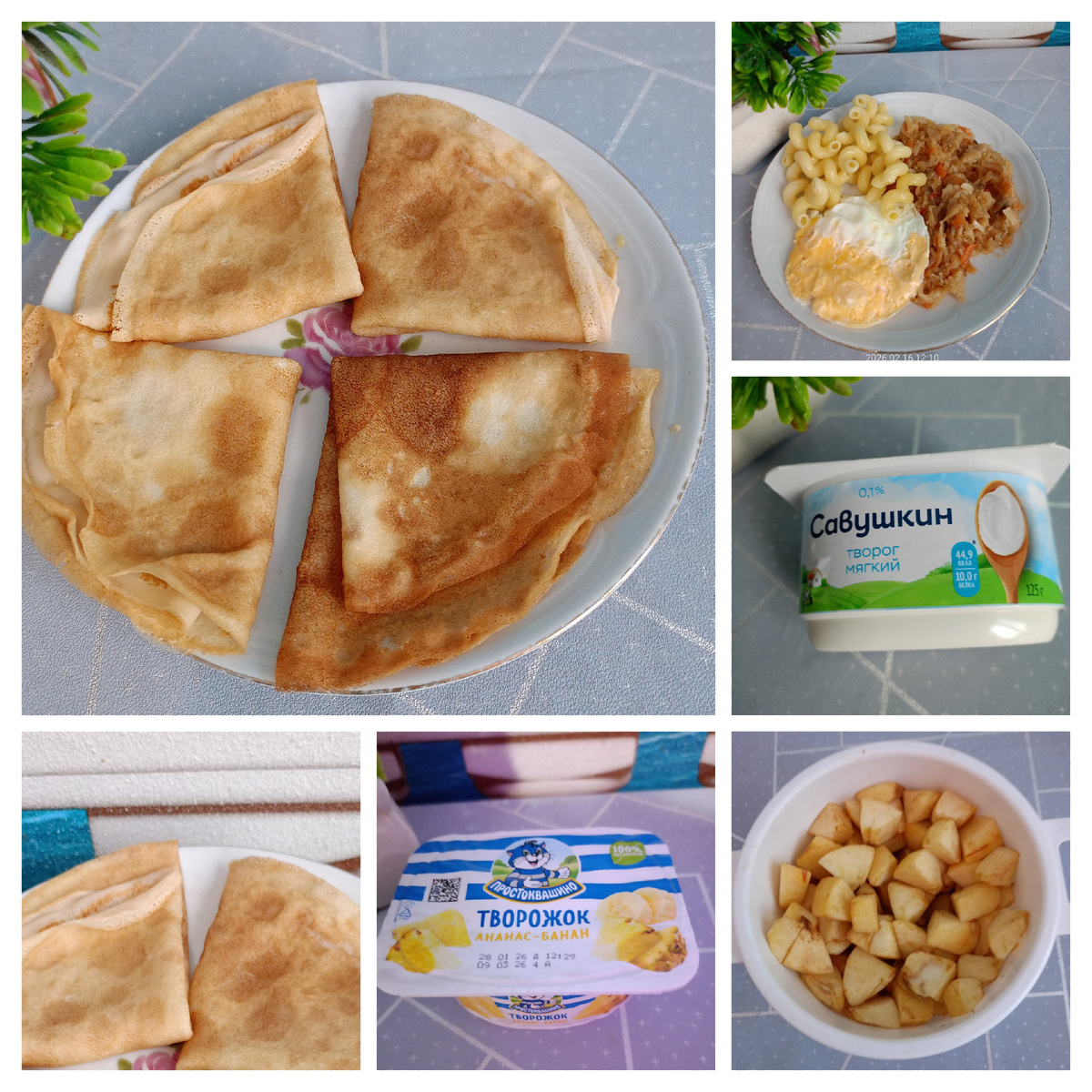 •Обед в 18.30 блинчики заварные 2 шт и творожок Простоквашино.