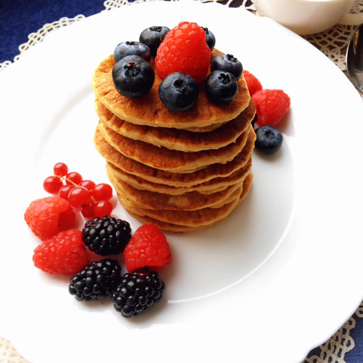 ✔ Яйцо — 1 шт.; ✔ Кефир 2,5% — 250 мл (1 стакан); ✔ Мука полбяная цельнозерновая —1 стакан (≈130 г); ✔ Сода пищевая —0,5 ч.л.; ✔ Оливковое масло (в тесто) —1 ст. л.; ✔ Соль —щепотка; ✔ Подсластитель — по желанию; ✔ Масло растительное (для смазывания сковороды) — 5 г (1 раз, кисточкой). Кефир подогреваем в кастрюльке на небольшом огне, добавляем соду, отставляем в сторону. 1 яйцо взбиваем вилкой со щепоткой соли, добавляем подходящий вам подсластитель. Имейте в виду, что полбяная мука сама по себе чуть сладковатая, поэтому подсластителя нужно совсем немного, а если вы решите подать их с ягодой или топпингом, то без него можно совсем обойтись. Добавляем к яйцу кефир, перемешиваем, всыпаем муку, перемешиваем, вливаем 1 ст. л. оливкового масла и оставляем на 15 минут, чтобы тесто дошло. Лучше поставить его к тёплой плите. Кисточкой смазываем сковороду небольшим количеством масла. Это нужно сделать всего один раз, дальше панкейки будут печься на сухой сковороде. Вливаем ложкой тесто в сково