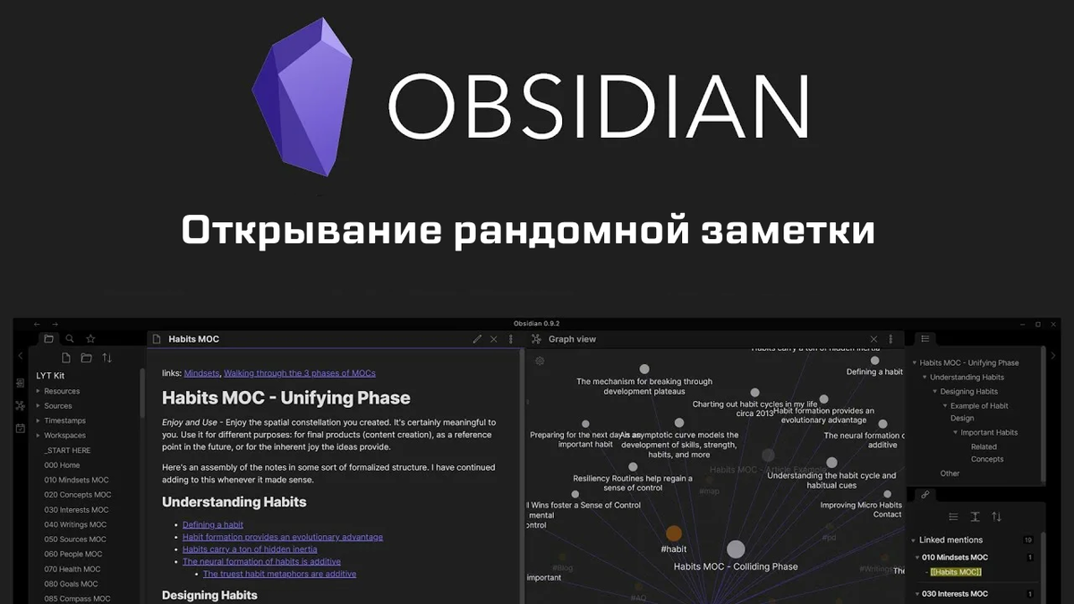 Это бесплатный плагин из сообщества Obsidian. При каждом открытии приложения или по нажатию горячей клавиши он открывает случайную заметку из вашего хранилища. Зачем это полезно: ✅ **Всплывают старые идеи** — заметка «10 тем для Дзен» от ноября может стать контент-планом на февраль; ✅ **Напоминания о клиентах** — случайно открывается `#иванов_сайт` с пометкой «связаться в феврале»; ✅ **Повторение знаний** — конспекты курсов, которые вы забыли, снова попадают в поле зрения; ✅ **Случайные связи** — видите заметку про Obsidian рядом с заметкой про Telegram-ботов — рождается новая идея для кворка; ✅ **Мотивация** — открываете старую заметку «Цель: 100 кворков» и вспоминаете, куда двигаться. Статистика: если у вас 500 заметок и вы открываете 1 случайную в день — за год вы пересмотрите 365 забытых файлов. Это как бесплатный редактор памяти. --- **Как установить плагин (пошагово)** 1. Откройте Obsidian и нажмите на шестерёнку (Настройки) в левом нижнем углу; 2. В меню слева найдите раздел **C