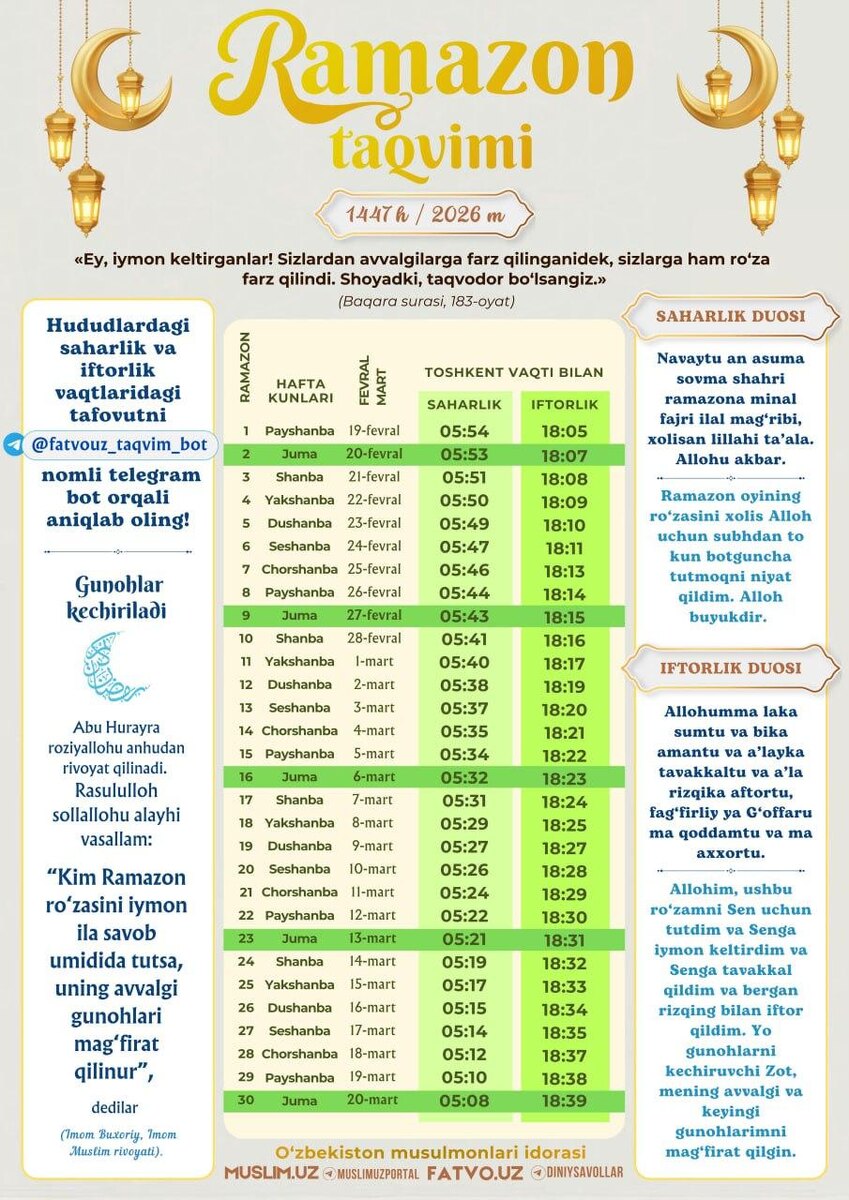 Musulmonlar idorasi 2026-yilgi ramazon taqvimini e’lon qildi @daryolive