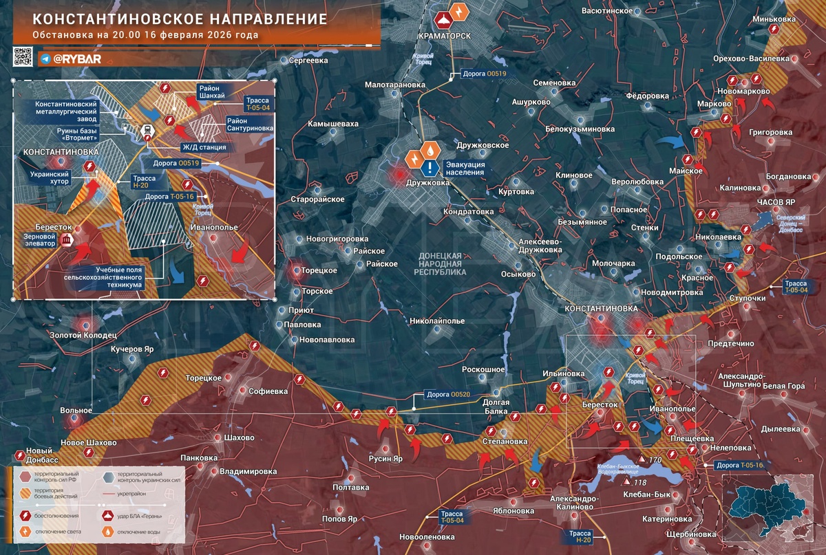 С Константиновского направления продолжают поступать свидетельства ожесточённых боёв за город и его подступы. На северо-восточной окраине сохраняется обширная «серая зона» к северу от трассы Т-0504. Там действуют малые группы, идут бои в районе вокзала и в частном секторе. Российские штурмовые подразделения действуют в условиях численного превосходства противника, несмотря на активную работу операторов БЛА по коммуникациям, транспорту и пунктам дислокации украинских формирований. С южной окраины города также появились данные о действиях малых групп в районе «Украинский хутор». Закрепиться там пока не удалось, опубликованные материалы, вероятно, носят архивный характер. Вместе с тем сам факт продвижения позволяет говорить о зачистке Берестка и переходе населённого пункта под контроль. Иванополье ранее было очищено от присутствия украинских подразделений, однако риск их проникновения через поля сохраняется. Между Берестком и Иванопольем расположены поля сельскохозяйственного техникума, к