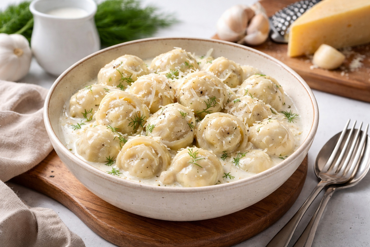 Сливочные пельмени для меня - это не «соус сверху», а сама идея нежности. Когда тесто тонкое, но упругое, а начинка сочная и мягкая, будто в неё заранее спрятали ложку сливок. Ни сухости, ни резкого лука - только плотный мясной вкус и та самая домашняя уютность.
