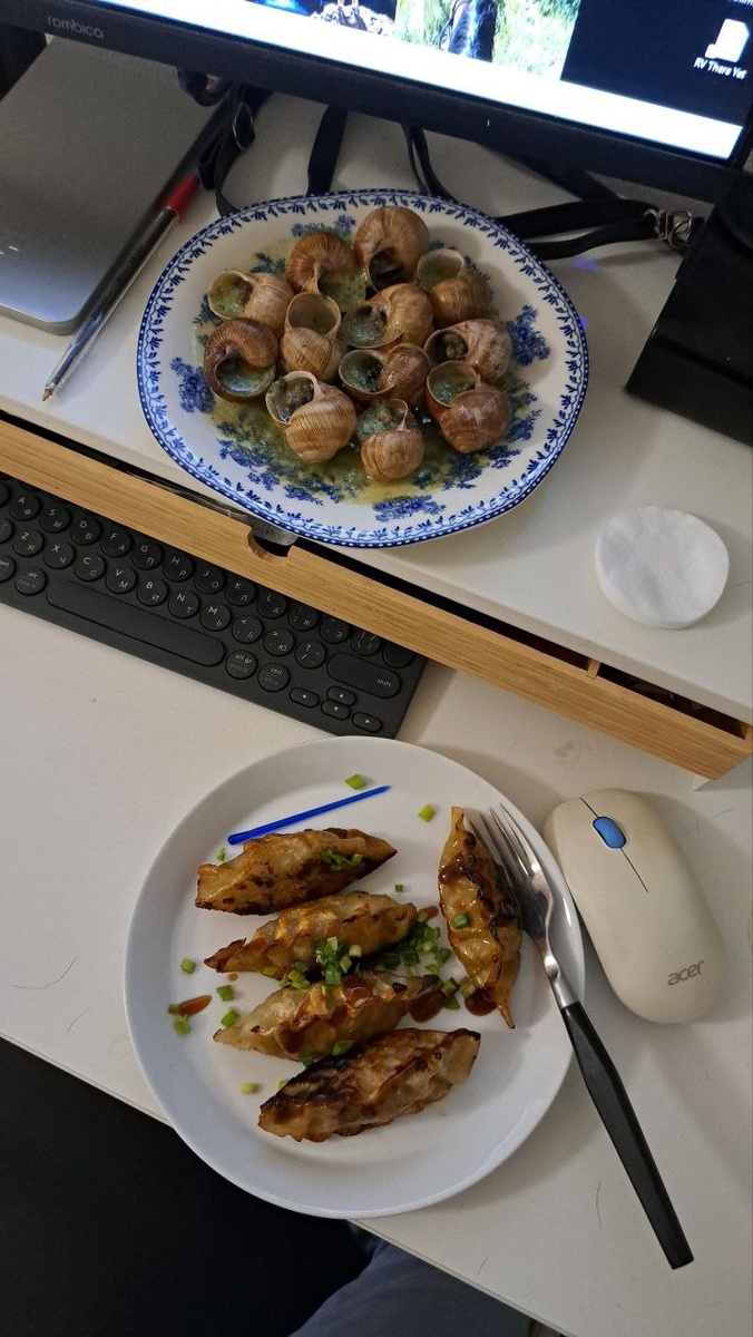 На ужин были гедза и улитки.