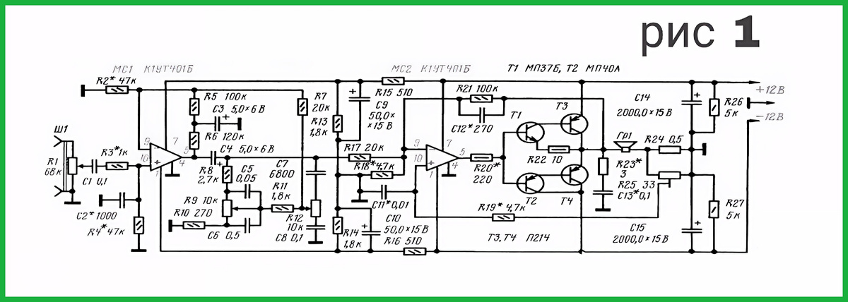 - MC1, MC2 (К1УТ401Б) - интегральные микросхемы усилителя;