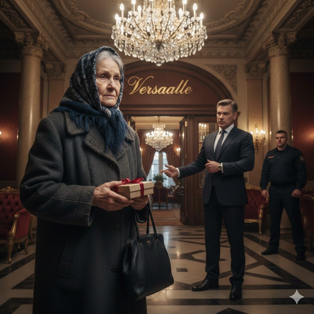 В холл вошла пожилая женщина. Ее старое, видавшее виды драповое пальто цвета мокрого асфальта казалось серым пятном на фоне позолоты. На голове — промокший пуховый платок, в руках — потертая кожаная сумка. Она замерла у входа, щурясь от яркого света хрустальных люстр.