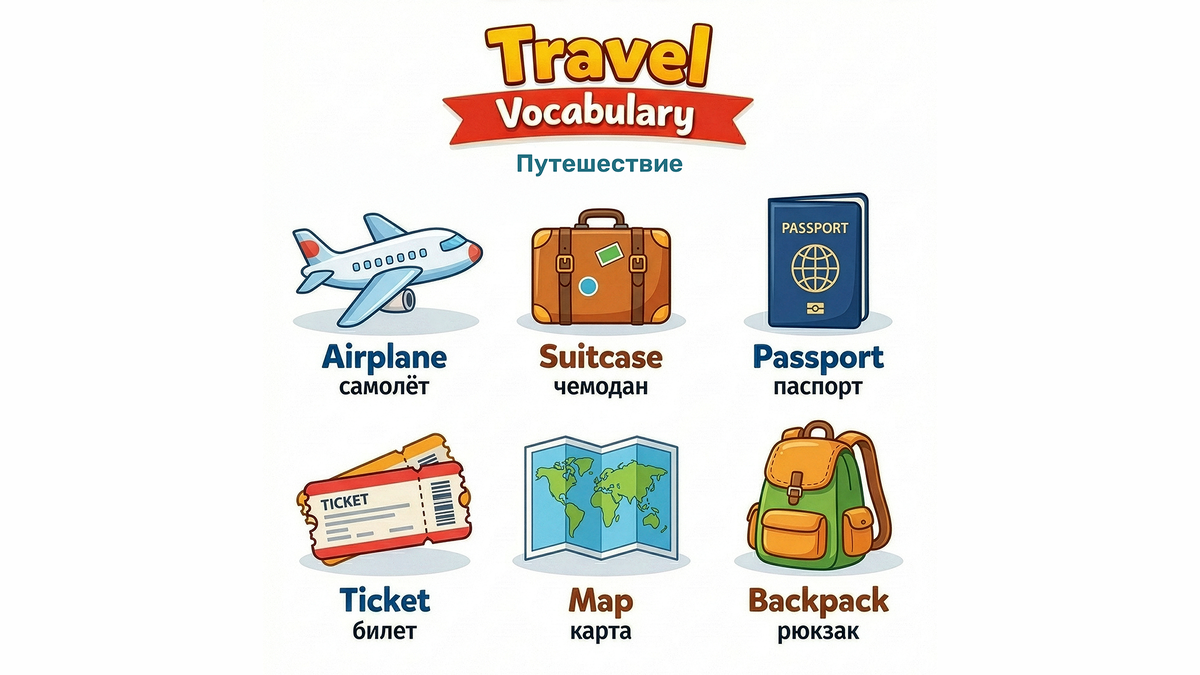 Полезные английские слова из категории Путешествие! 🔸 Airplane [ 'ɛr,pleɪn ] – самолёт 🔸 Suitcase [ 'sut,keɪs ] – чемодан 🔸 Passport [ 'pæ,spɔrt ] – паспорт 🔸 Ticket [ 'tɪkət ] – билет 🔸 Map [ mæp ] – карта 🔸 Backpack [ 'bæk,pæk ] – рюкзак Если понравилось, поставьте 👍 и напишите пару слов в комментариях – это лучшая мотивация делать полезный контент ❤️ Также подписывайтесь на наши каналы, где учить английский ещё удобнее: Телеграм - https://t.me/play_en ВКонтакте - https://vk.com/playen
