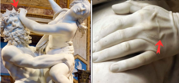 Поры кожи, видимые при увеличении. Складки ткани с нитями, различимыми по отдельности. Волосы, не прорезанные в камне, а будто выросшие из него. Ногти с лунками и кутикулой. Веки с мельчайшими морщинами, которые появляются, когда человек щурится.