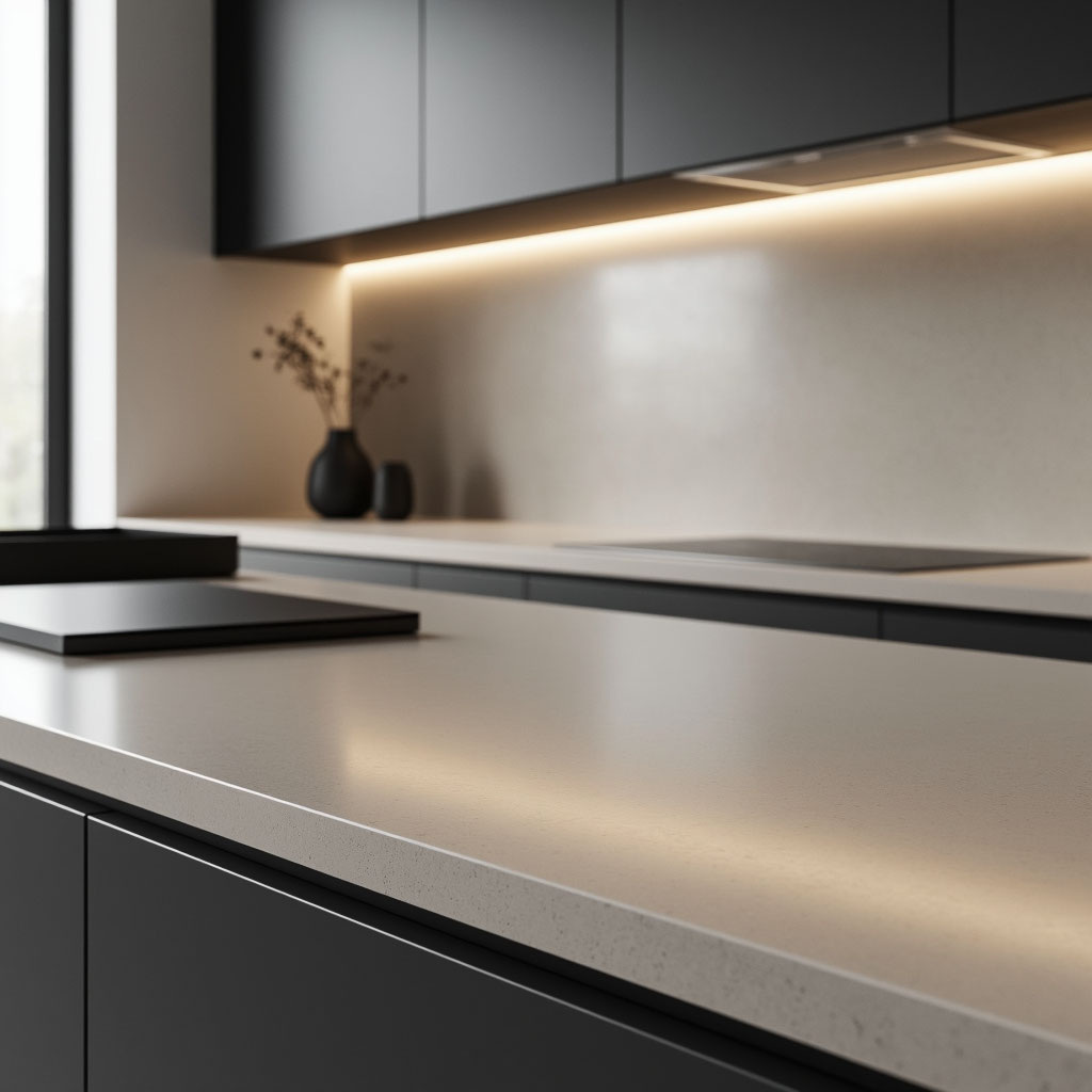 - · Кварцевый агломерат: Очень прочный, но стык будет виден (полируется, но шов остается). Тяжелый и дорогой.