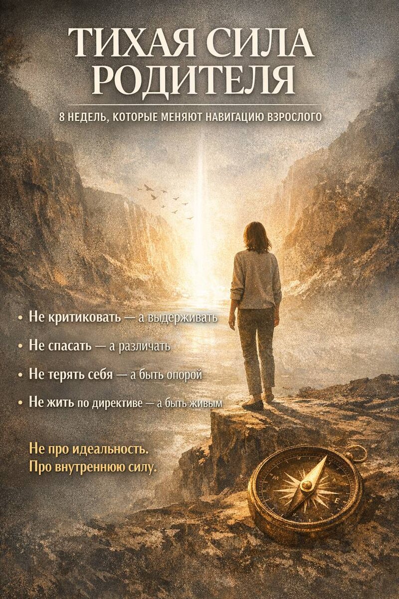 8 недель, которые меняют не поведение ребёнка, а навигацию взрослого Ты уже увидела свои директивы. Теперь вопрос — что дальше? Можно оставить всё как есть. Жить «осознанно», но по-старому. Иногда срываться. Иногда терпеть. Иногда чувствовать вину. И тихо передать ребёнку то, что когда-то передали тебе. А можно сделать взрослый шаг. Не против родителей. Не против себя. А за новое качество родительства. Этот курс не про «как правильно воспитывать». Он про то: как перестать реагировать из старой директивы как не кричать, когда внутри включается страх как не давить, когда активируется контроль как не растворяться в ребёнке как не повторять «из лучших побуждений» И главное — как вырастить опору внутри, чтобы ребёнок не стал твоим триггером. Почему 8 недель? Потому что перепрошивка — это процесс. Нельзя: — раз увидеть — один раз прожить — и навсегда стать другой Можно — шаг за шагом: Осознать свои активные директивы Понять, как они включаются в родительстве Отследить телесные реакции Нау