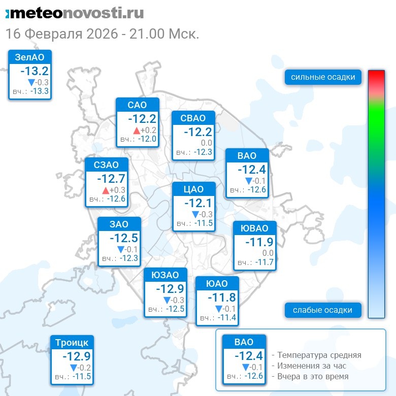 В 21:00 в Москве было от -13.3°C до -10.9°C, средняя температура -12.3°C #погода #Москва #зима #температура #16февраля #понедельник