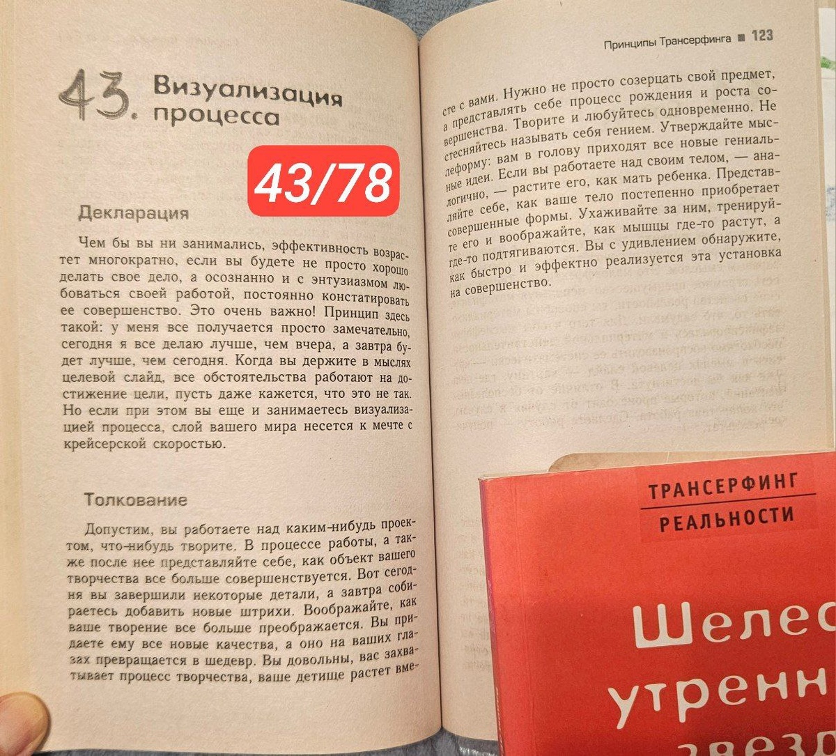 43/78 Практикум управления реальностью - Трансерфинг Визуализация процесса "Чем бы вы не занимались, эффективность возрастает многократно, если вы будете не просто хорошо делать своё дело, а осознанно и с энтузиазмом любоваться своей работой, постоянно констатировать её совершенство." "У меня всё получается просто замечательно, сегодня я все делаю лучше, чем вчера, а завтра будет лучше, чем сегодня. " "В процессе работы, а также после нее представляйте себе, как объект вашего творчества все больше совершенствуется." "Вы довольны, вас захватывает процесс творчества, ваше детище растет вместе с вами." "Утверждайте мыслеформу: вам в голову приходят все новые гениальные идеи." ❣ "Единственный способ хорошо работать — это любить то, что вы делаете. Если вы ещё не нашли этого, продолжайте искать. Не останавливайтесь" — Стив Джобс. А вы правда любите то, что вы делаете, или пытаетесь себя убедить, что любите? 🤔 Как было бы здорово, если бы каждый любил то, что он делает 🥰 #БлагоТ