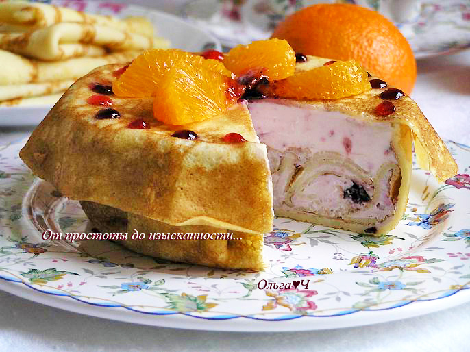 клементин и джем для украшения Приготовление: Для малинового крема смешайте 150 г творожного сыра, малиновый джем и 1 ч. л. лимонного сока. Для черничного крема смешайте оставшийся творожный сыр, черничный джем и лимонный сок. Форму для торта (у меня диаметром 11 см) застелите блинчиком. На дно выложите 1 ст. л. черничного крема. На 3 блинчика нанесите черничный крем. Сверните каждый в рулет и выложите по спирали в форму. Сверху выложите малиновый крем, разровняйте, затяните пищевой пленкой и уберите в холодильник на пару часов. Перед подачей выньте торт из формы. Накройте оставшимся блинчиком, украсьте капельками малинового и черничног